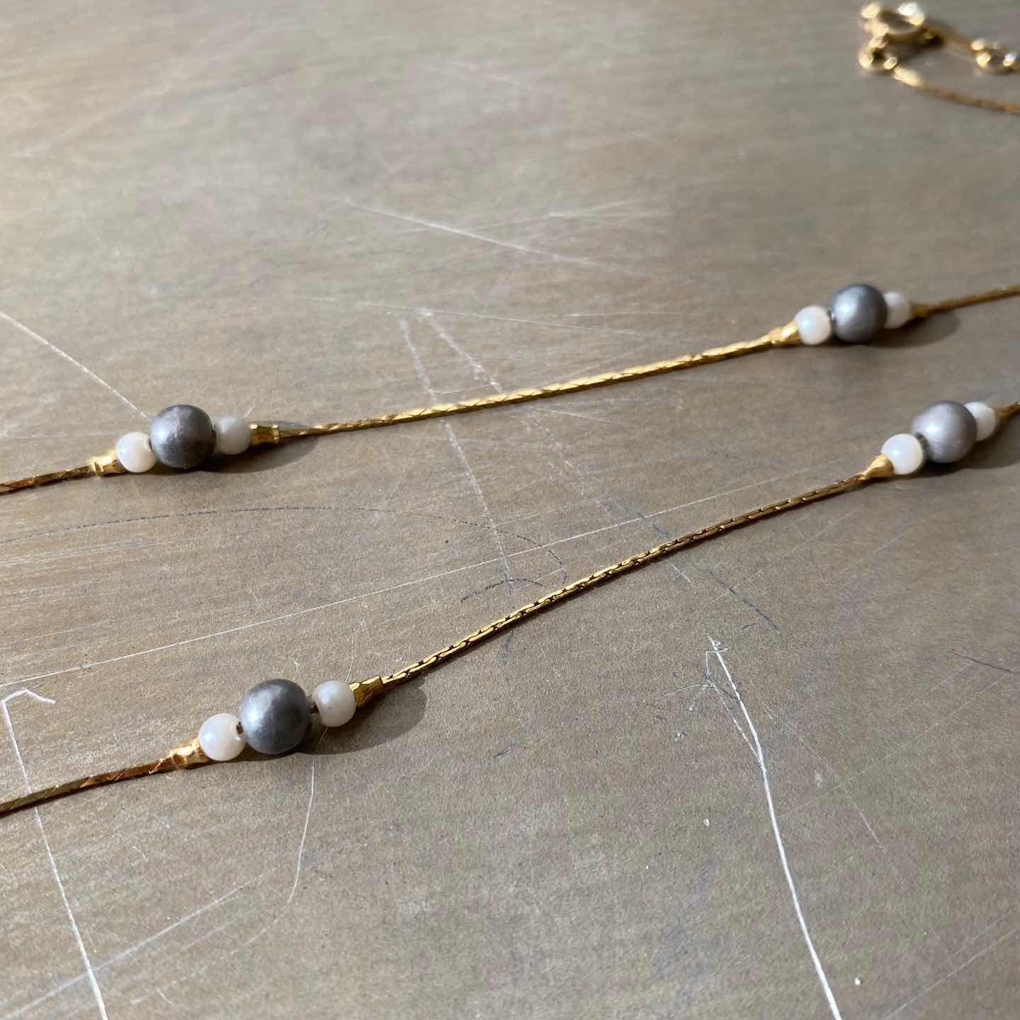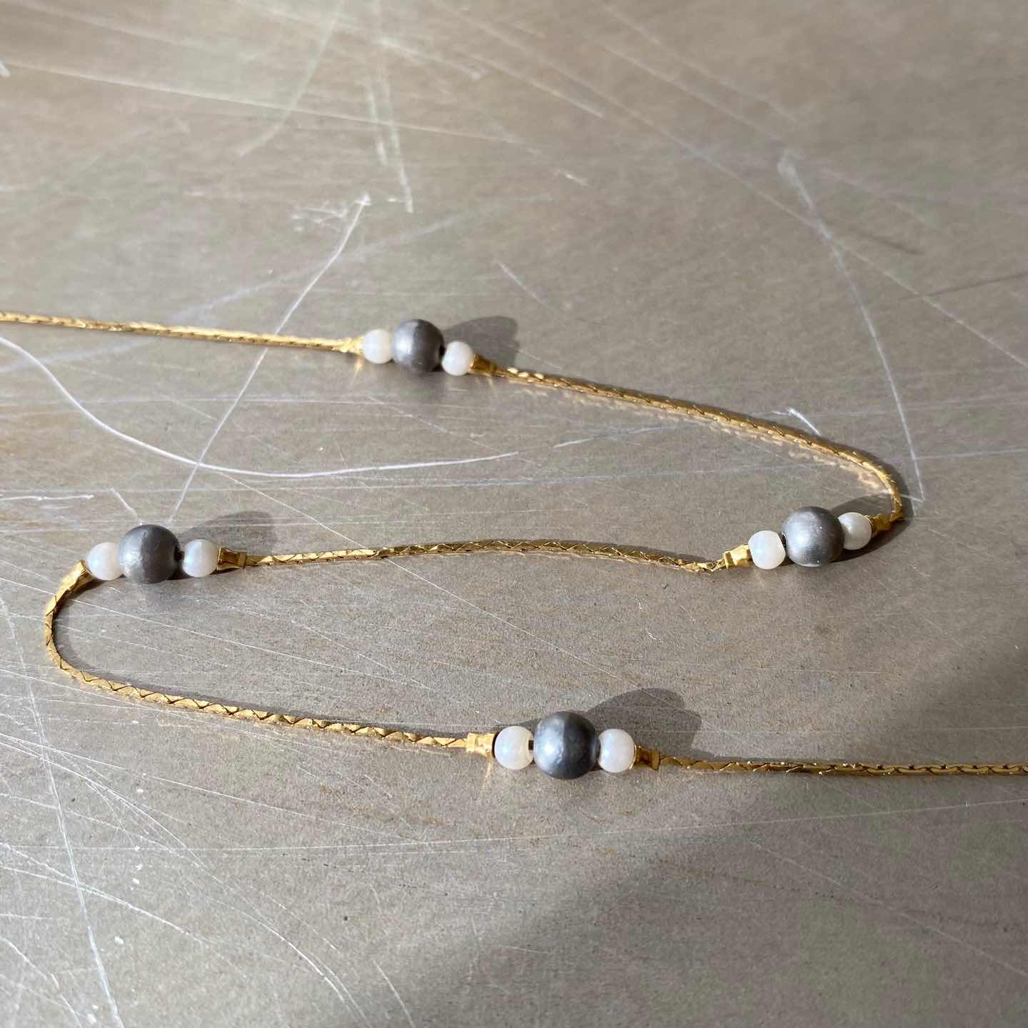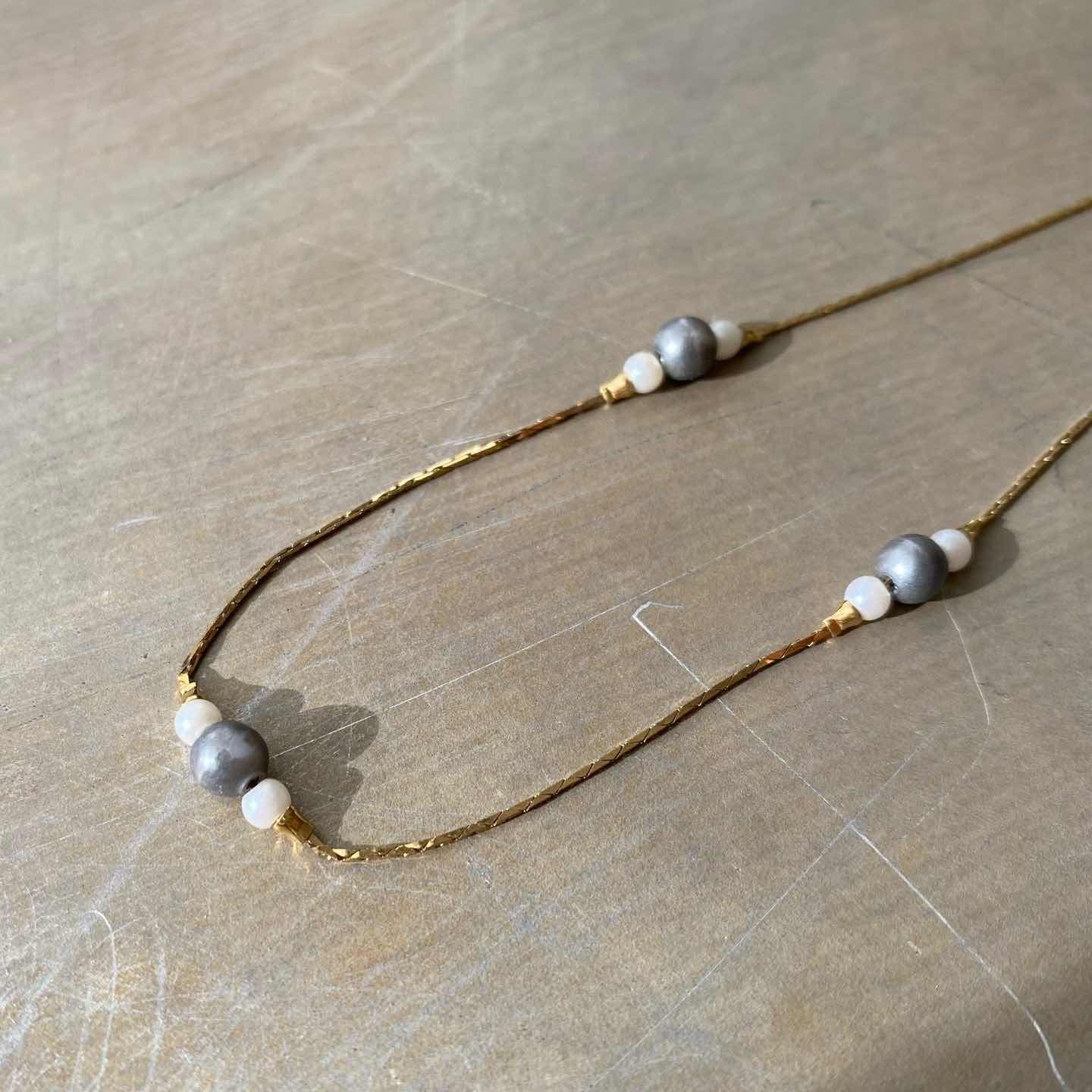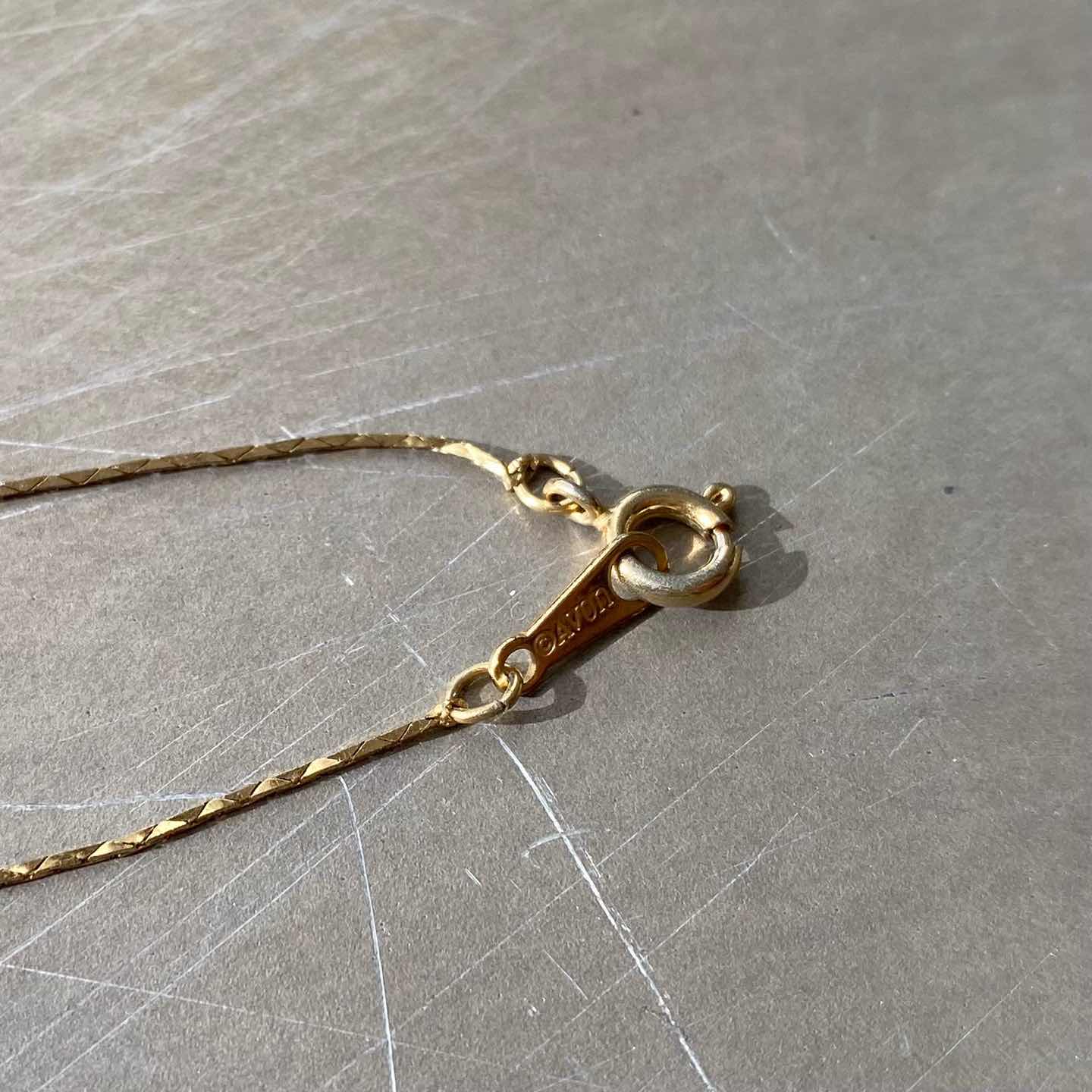 1886年にNYで香水会社として創業し、1971年よりコスチュームジュエリーの制作を始めたブランド「AVON」のUSAヴィンテージネックレス。繊細に輝くチェーンにグレーとホワイトのパールマッチした素敵なデザイン。シンプルで身につけやすくデイリーユースにもおすすめのアイテムです。 □Materials メタル(ゴールドメッキ)、イミテーションパール □Size 全長 約45㎝ 幅 約5㎜ 2g □Brand AVON(エイボン) 刻印入り □Condition【C】 引き輪部分に変色やパールにスレや色ムラがみられます。中古品であることをご理解のうえお買い求めください。ご購入前に必ずショッピングガイドのご確認をお願いいたします。 【S】未使用 【A】未使用に近い 【B】やや使用感あり 【C】使用感あり Item No.3426
