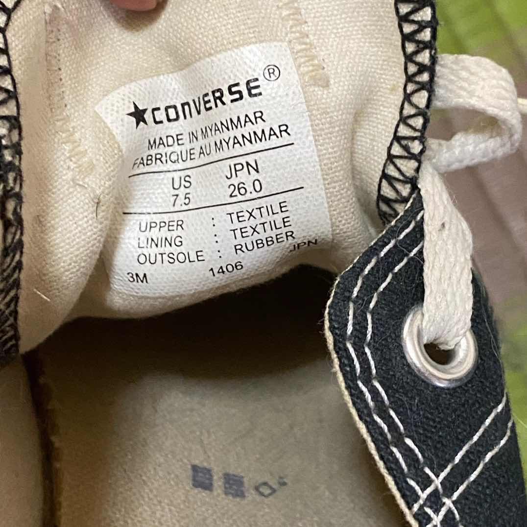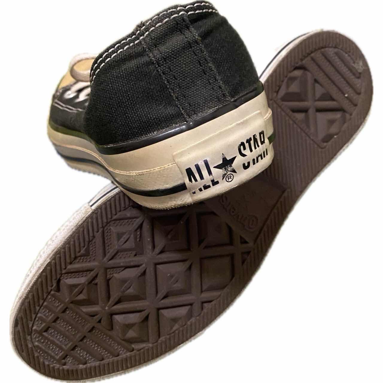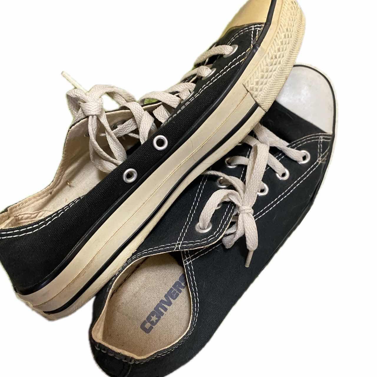 00s converse オールスターLO 26cm 黒 箱無し コンバースが発表した。もうオールスターは生産しないと言うニュースは市場に衝撃を与えました。 よって今後オールスターは2000年代のであろうが、確実にプレミアがつきます。 希少価値はどんどん上がるし、正直オールスターって永遠にかっこいいアイテムですよね。 今回はストック品だったやつだと思われます。ストック焼けが写真見てわかるように片方にだけありますが、 全くもって気になりません。だって靴消耗品、 トゥーの部分だけですよ? 変色?気にする意味私には、理解できないんで、 一番靴でユーズドを買うときに注意する時はソールとかですよね。ダメージがあるか一切ありません。ソウルヘリも一切なしです。 しかも大人気のブラックのロー サイズ表記ジャパン26センチです。メーカーのサイズ表などを参考にください。状態は全て明記してますし、箱なし単品のみ ご理解いただく方は即購入よろしくお願いいたします。