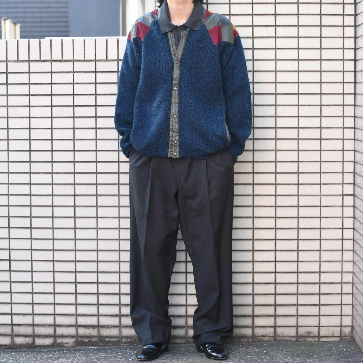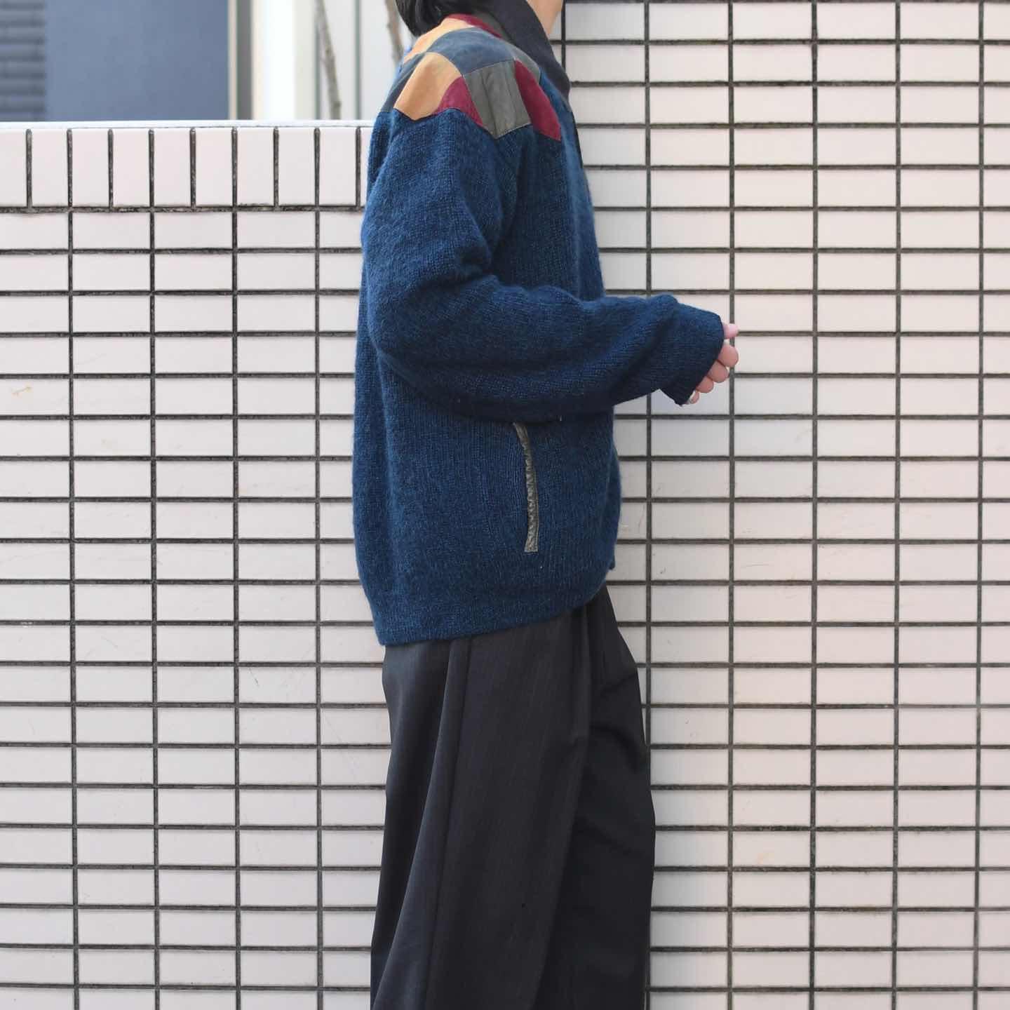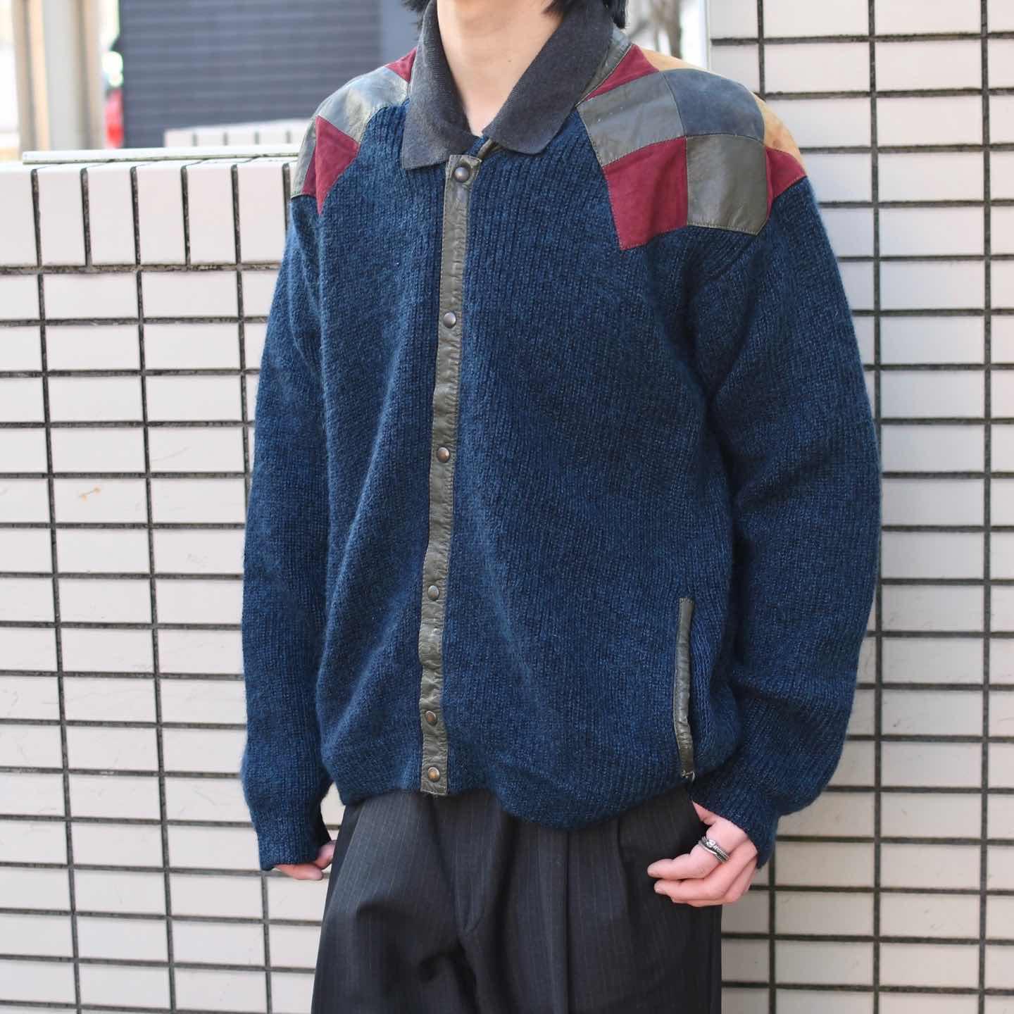古着 レザー パッチワーク ニット ブルゾン ブルゾン デザインニット ブルー