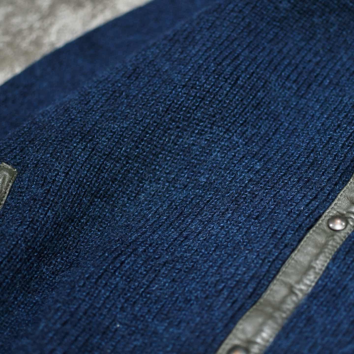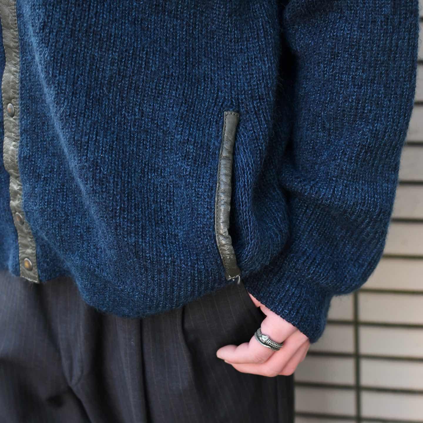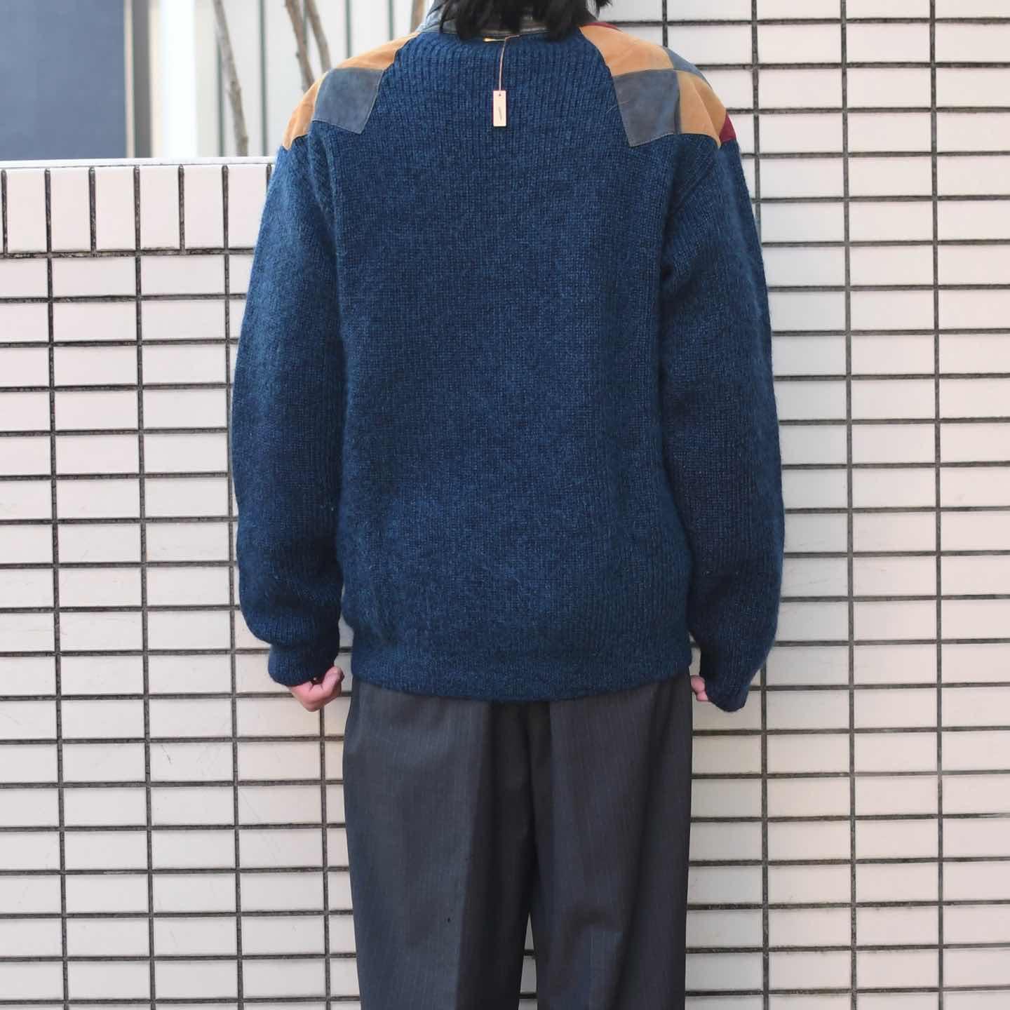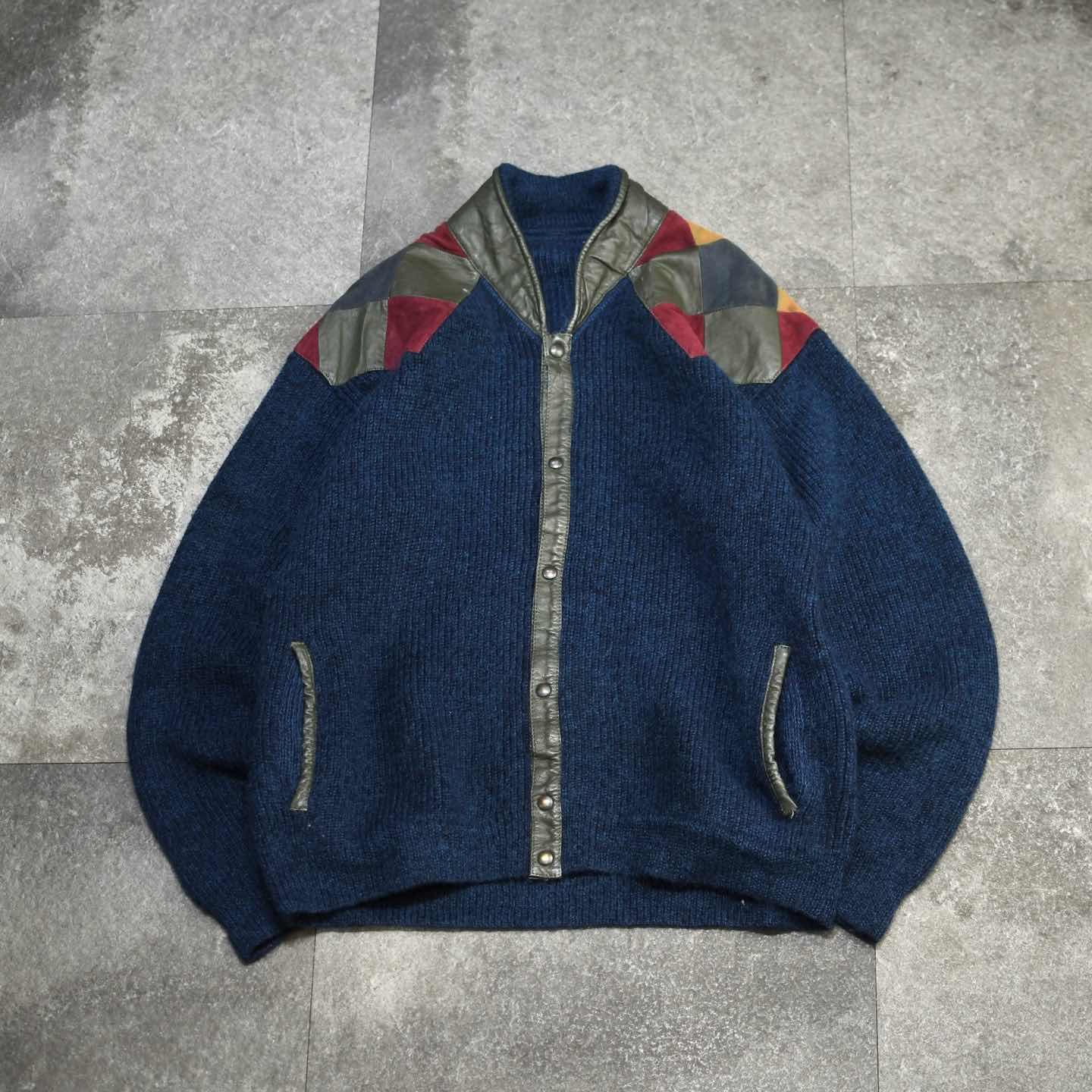古着 レザー パッチワーク ニット ブルゾン ブルゾン デザインニット ブルー