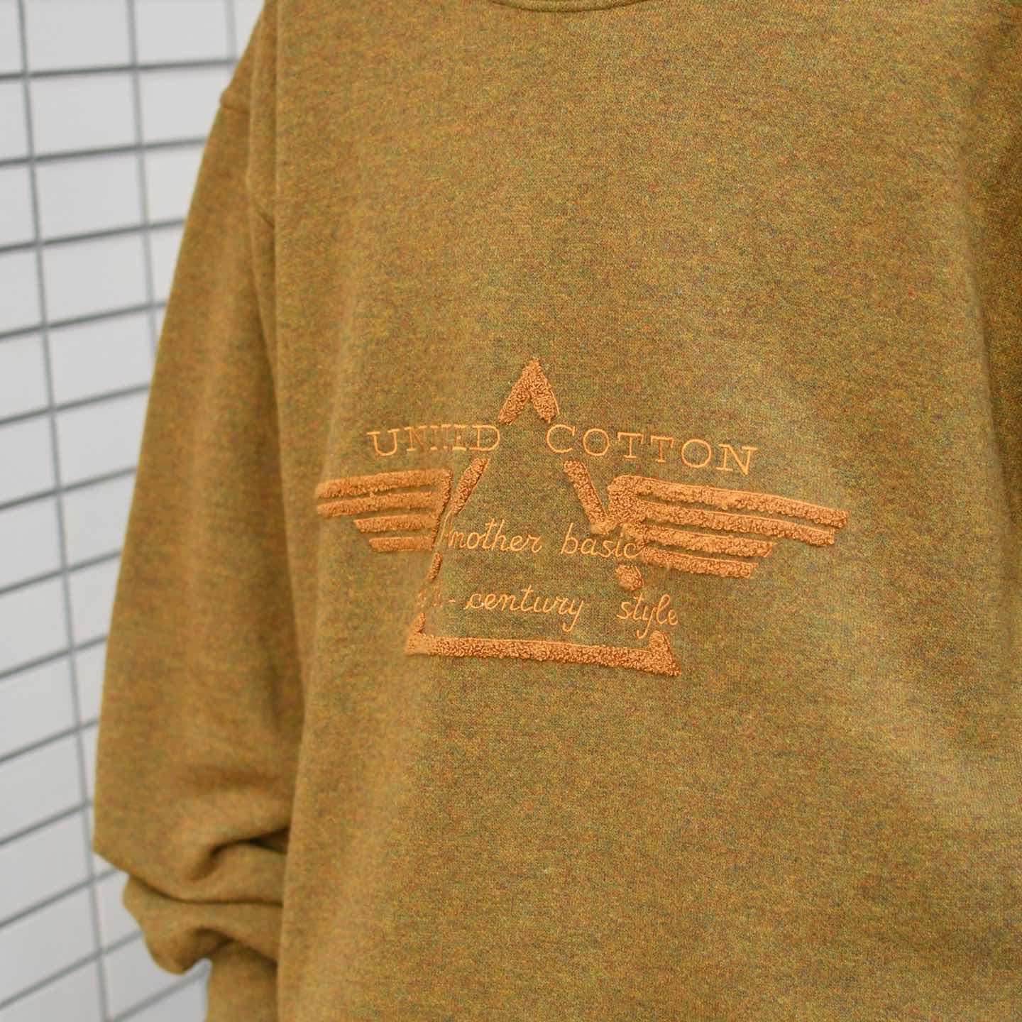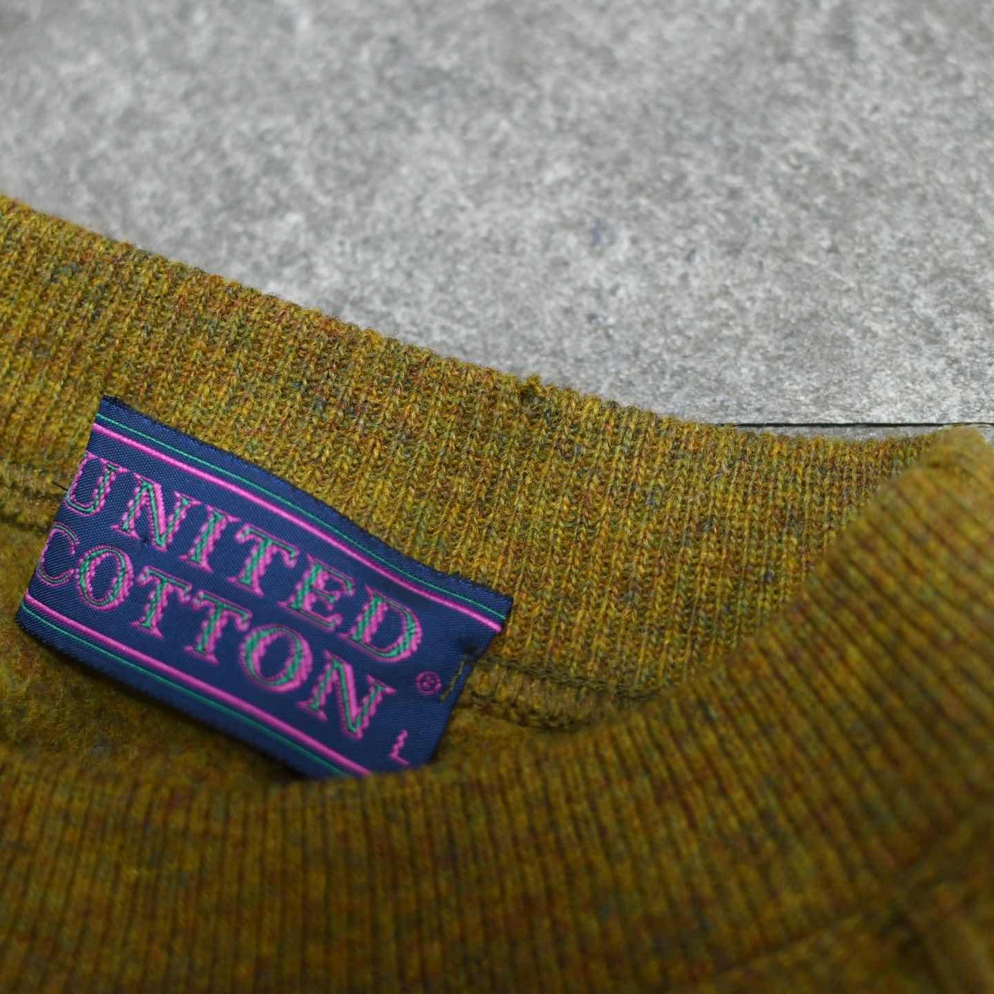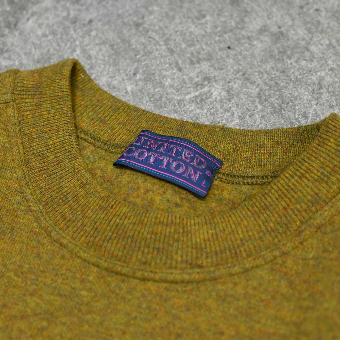 SIZE:L 着丈75cm 肩幅60cm 身幅63cm 袖丈66cm fabric/wool・nylon made in italy 着用画像 173cm/58kg ウールでスウェット。 初見ですし、なんとも面白いアイテムです。 ブランド名”UNITED COTTON”でありながら、 一切コットンを使用していないのも推し、、、 上品なメランジのボディに、ウールでありながら 裏地はふわっとしており、肌に刺激が無く着れるのは個人的に嬉しいところでした。 カジュアルになり過ぎず、スラックスなんかとも 合わせやすい変わり種スウェットとして、 手元にどうでしょう。 ※首元のリブにピンホールあり。 ※撮影状況により、実物と多少色が異なる場合が ございます。 ※古着を取り扱っているため、気づかない汚れや ほつれ等がある場合がございます。 ※サイズは着用感で選んでおり、 表記サイズは説明欄の最初に記載しております。 オーバーサイズ old vintage ヴィンテージ used 80's 90's アメリカ古着 ユーロ古着 POLO RALPH LAUREN Eddie Bauer OLD GAP LANDS' END ランズエンド LLBean エルエルビーン オールドギャップ エディーバウアー ラルフローレン ブルックスブラザーズ Brooks Brothers カーキ 茶色 などがお好きな方 #vintage #オーバーサイズ #old #used #90s #80s #古着 #ヴィンテージ #アメリカ古着 #ユーロ古着 #LLBean #エルエルビーン #EddieBauer #エディーバウアー #oldgap #オールドギャップ #LANDSEND #ランズエンド #NAUTICA #ノーティカ #ラルフローレン #POLORALPHLAUREN #ブルックスブラザーズ #BrooksBrothers #スウェット #トレーナー #デザインスウェット
