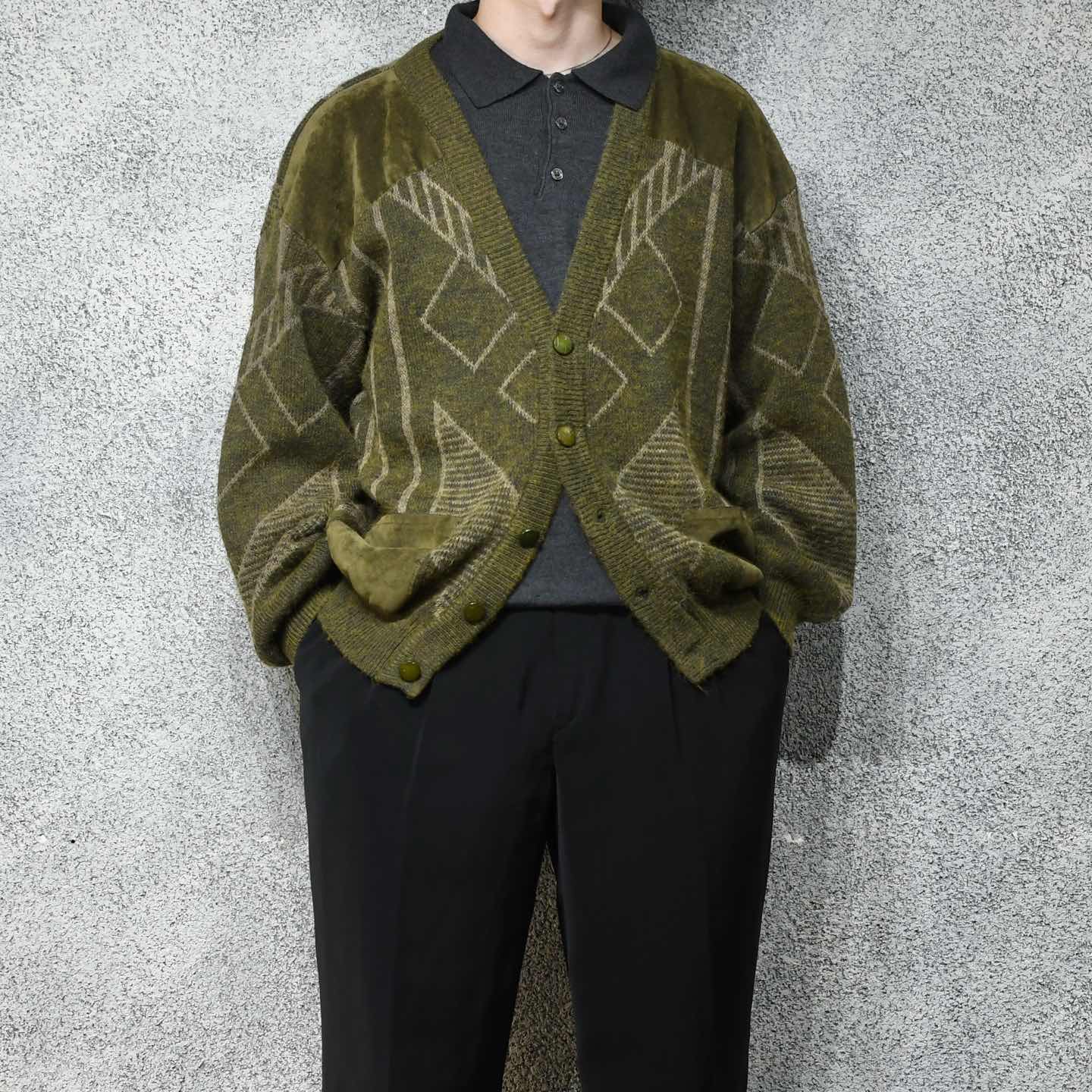 古着 モヘア混 デザイン カーディガン セーター カーキ 切り替え